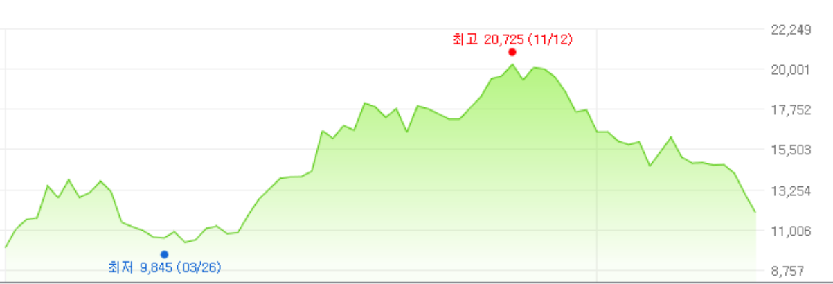 처음 정찰병 3주를 매수할 때에 최고점이 20,725원에서 많이 하락한 가격인 17,385원이었으므로 충분히 조정이 이루어진 후 매수를 결정했다고 생각했었다.