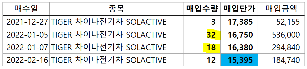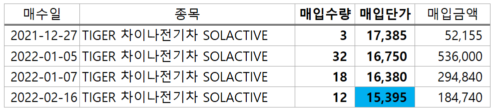 2022.03.17 - [ETF 매수일지] - TIGER 차이나전기차 SOLACTIVE 첫 매수