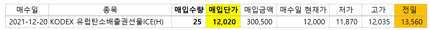아래 표는 나의 첫 탄소배출권 ETF 매수내역이다.