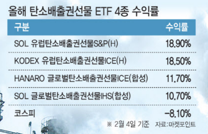 물론 위 자료는 2/4 기준으로 이후 한 때 큰 폭으로 출렁였지만, 3/11 현재는 다른 ETF들이 모두 마이너스 수익률인 가운데 탄소배출권 ETF만 7%로 플러스 수익률을 보이고 있는 상황이다.